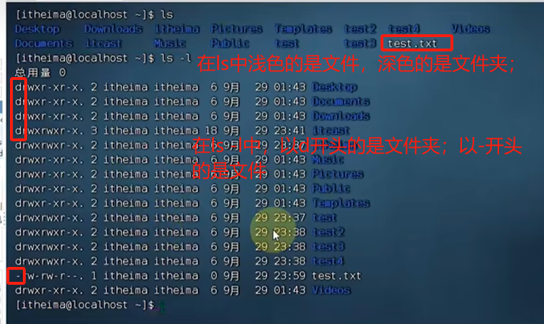 在列表展示中,d 代表文件夹,-代表文件,在平铺展示中,以颜色区分文件和文件夹;