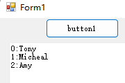 private void button1_Click(object sender, EventArgs e) { Students st = new Students(); st.Add(0, "Tony"); st.Add(1, "Micheal"); st.Add(2, "Amy"); foreach (var s in st) { Student st1 = (Student)s;