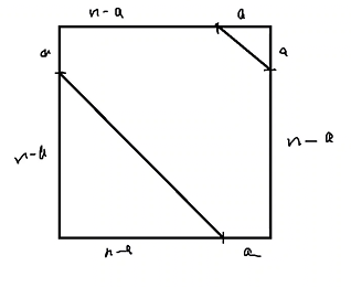 考虑问题等价于一个\(n\times n\)的网格,右上角挖掉一个边长为\(a\)的等腰直角三角形,左下角挖掉一个\((n-a)\cdot (n-a)\)的等腰直角三角形。剩下的每行选一个格子,选出的格子不能在同一列的方案数。
