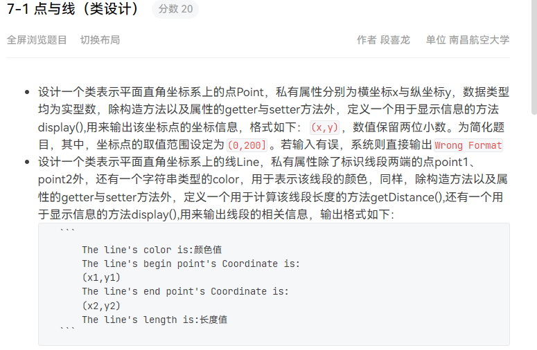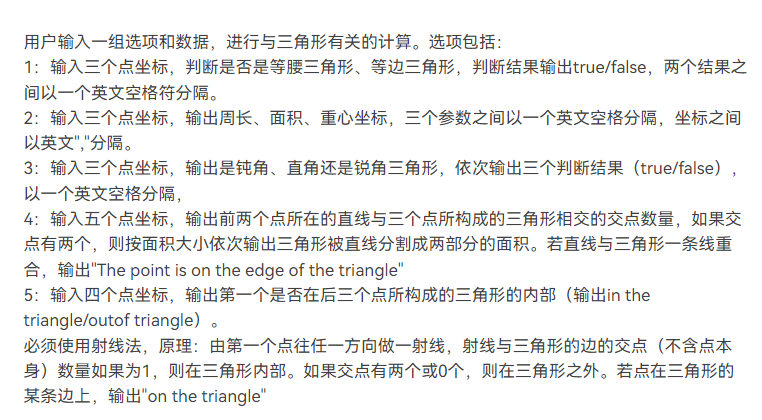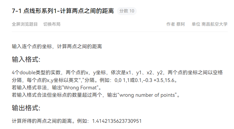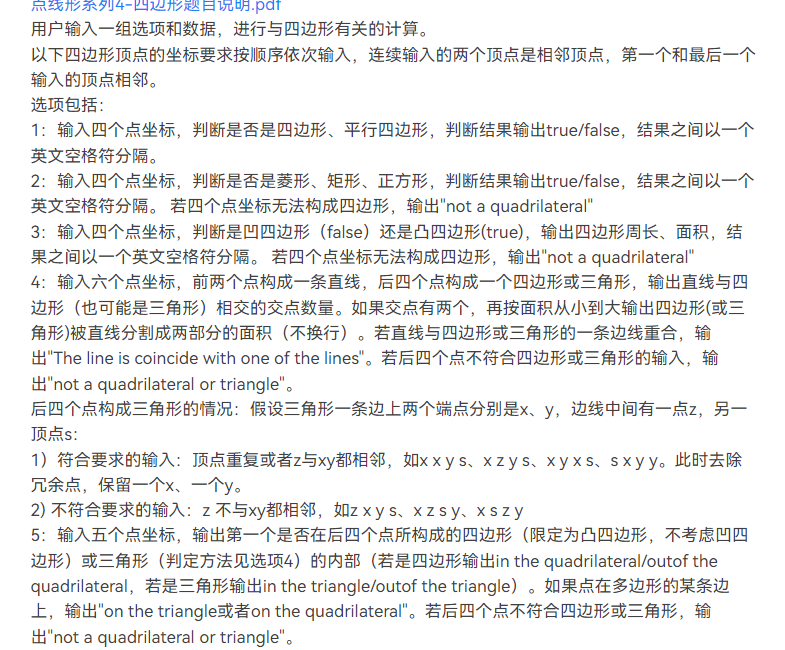 点线形系列一是这系列题目的开端,但看题目要求计算两点间距离感觉比较简单,但是再判断输入格式是否符合要求时却成为了一大难题,后面便产生了用正则表达式来解决的方案,于是便现学现用正则表达式,从而成功解决了判断输入是否符合格式要求的问题。