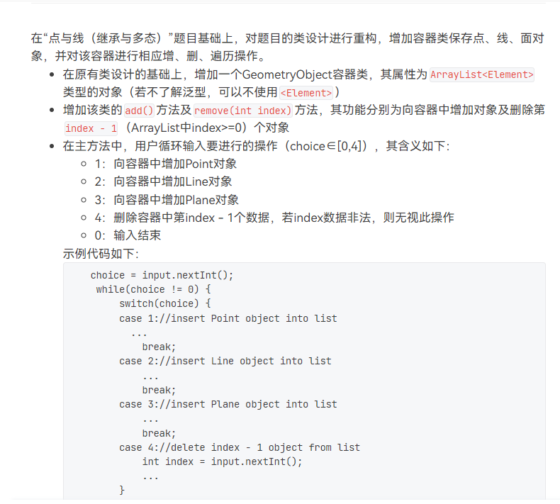 第三题要求新增一个容器类,可以选择增加或删除对象等功能,这题要注意的点便是,在删除这个方法中,删除首先要对链表进行判空,因为节点是从0开始的所删除的时候是index - 1而且在判断范围时要去最后一个节点,不然便会出现错误。
