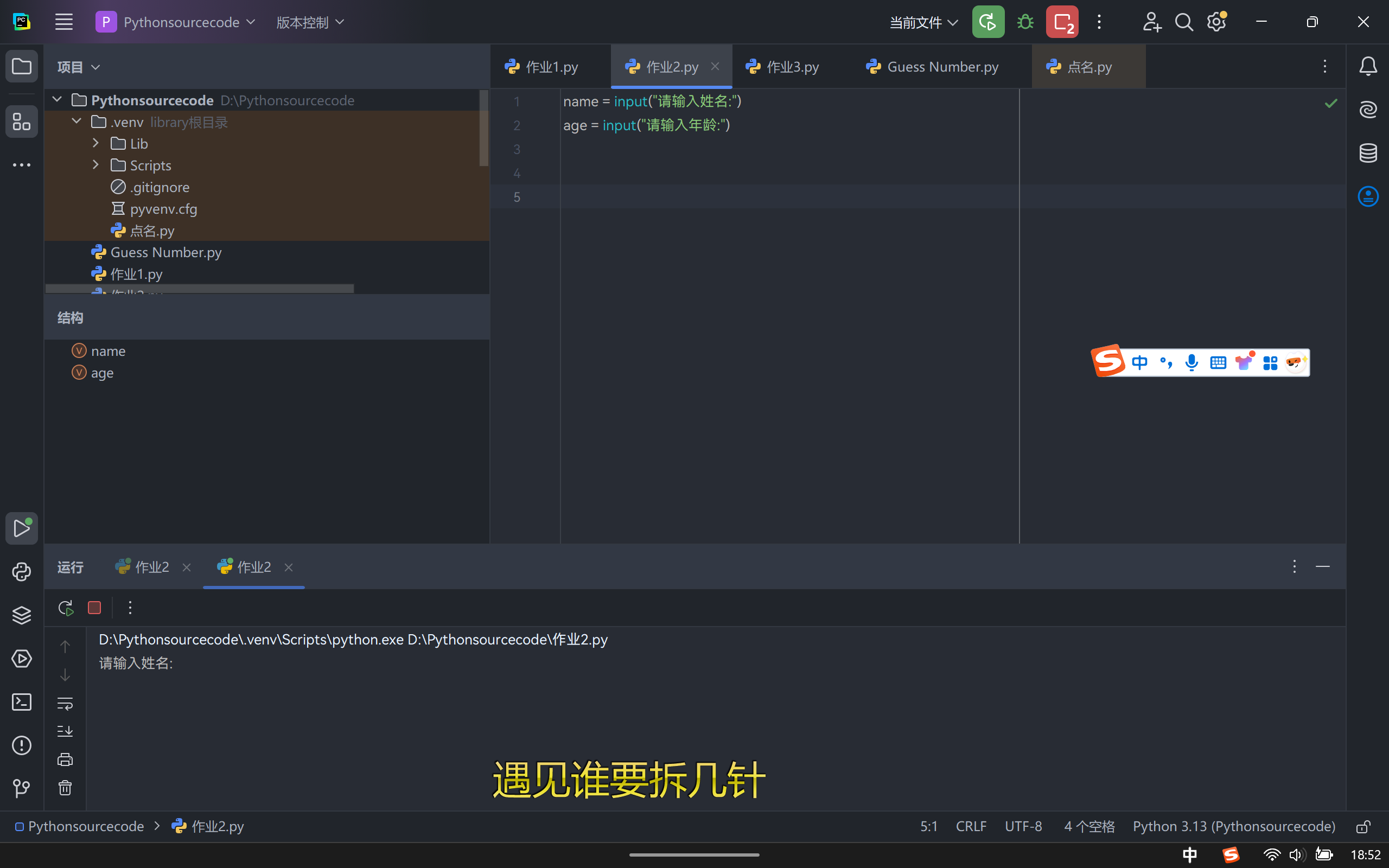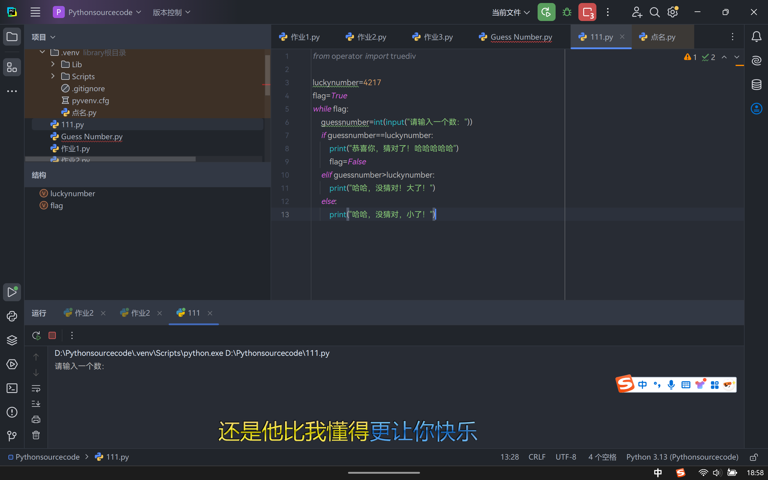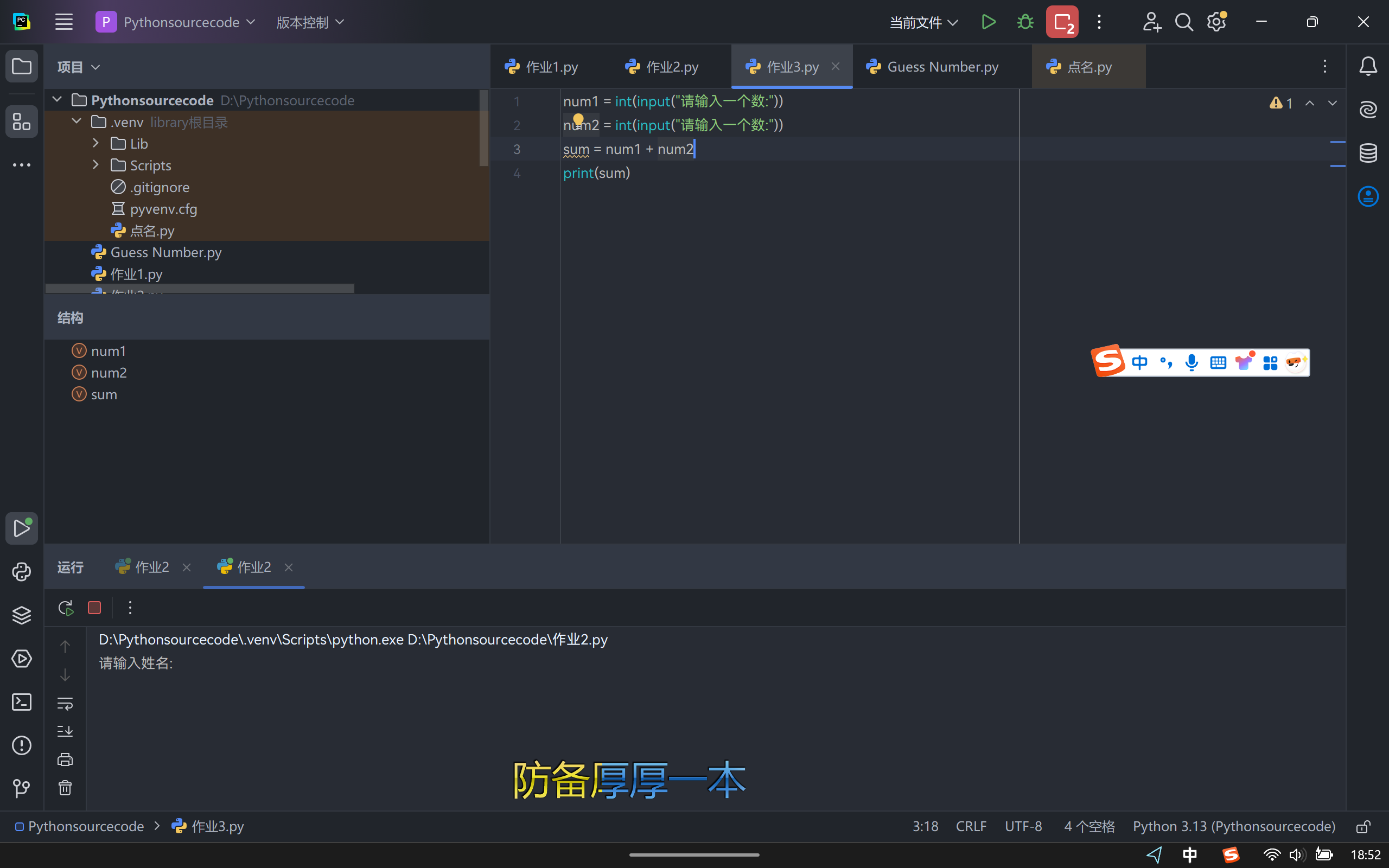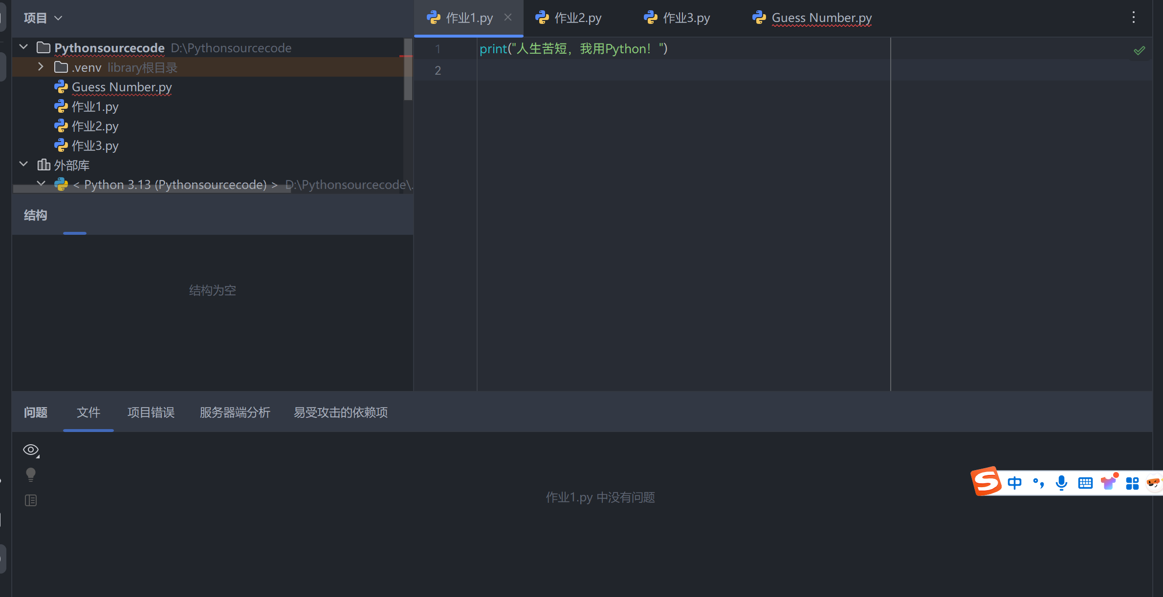 3.在PyCharm中编写简单的Python代码,编写程序,练习变量和类型、字符串、对象、缩进和注释等;了解了整数型、浮点型、字符串等数据类型。