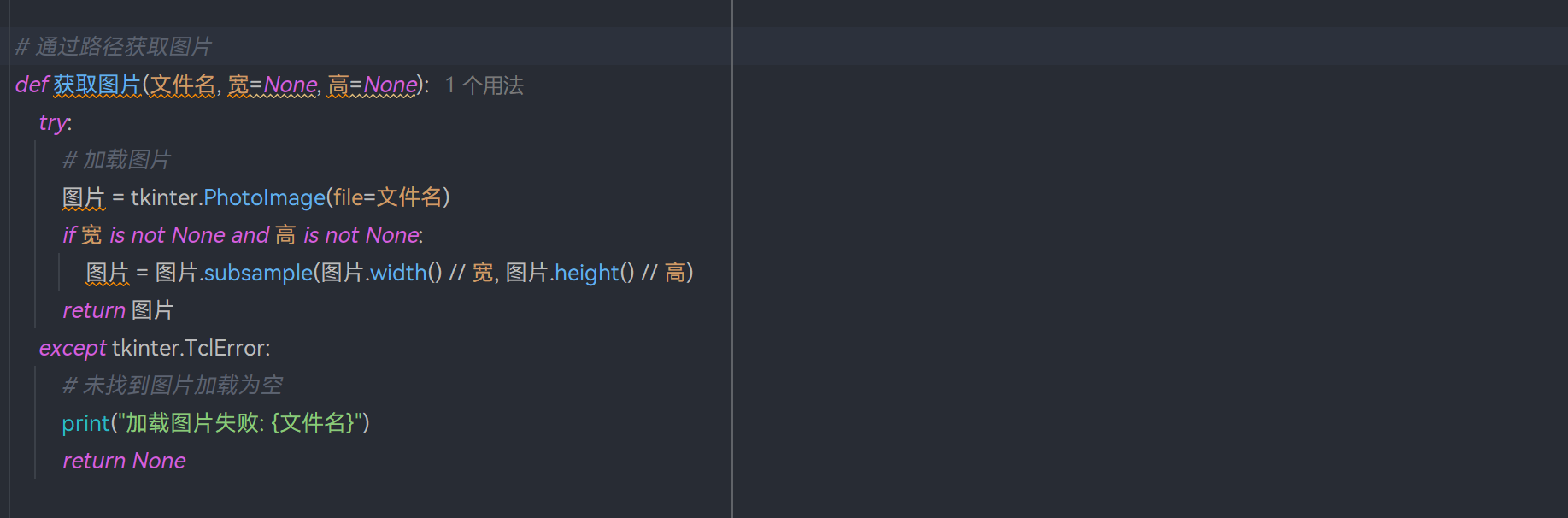 如果找不到图片或发生其他异常,则简单地回到None,表示图片加载失败或出现其他错误。