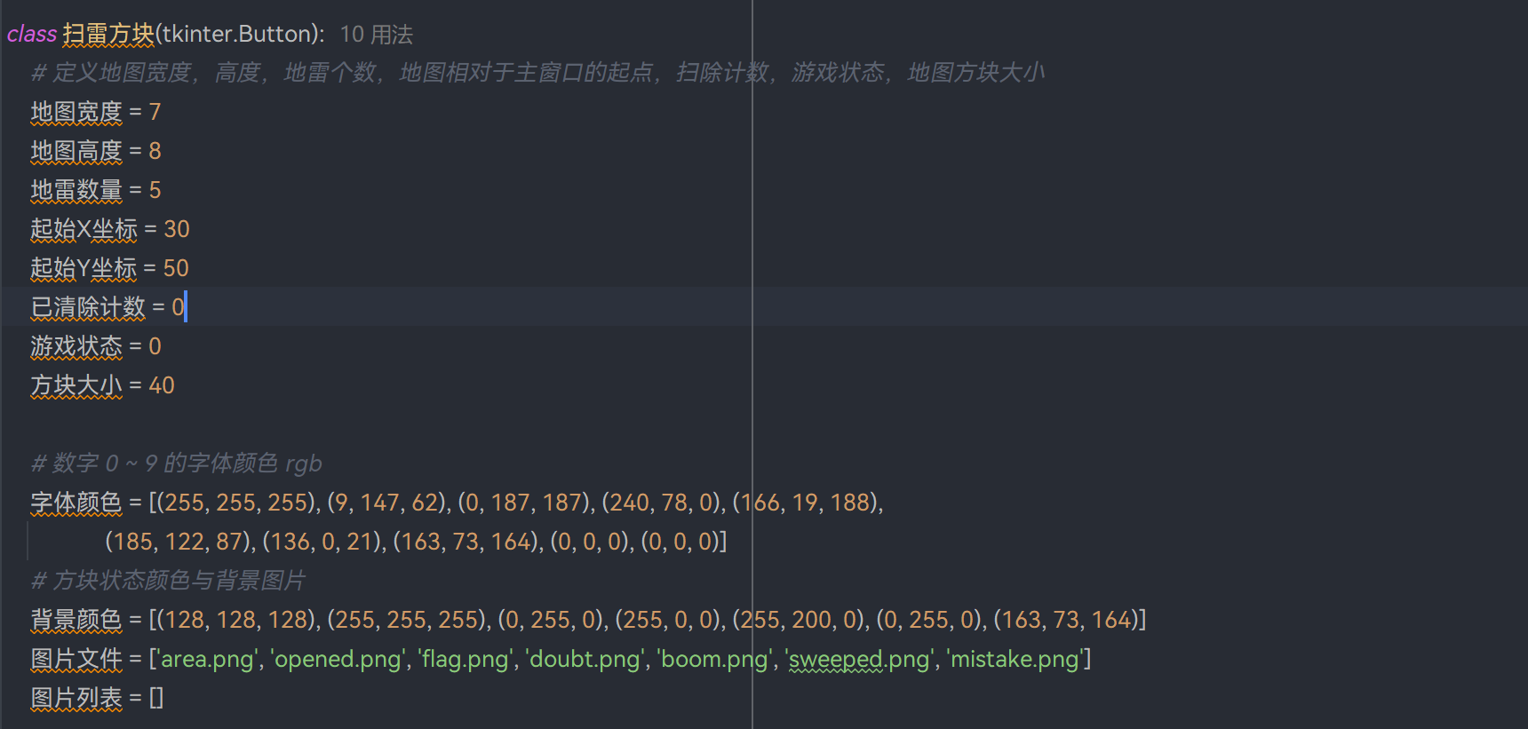# 定义地图宽度,高度,地雷个数,地图相对于主窗口的起点,扫除计数,游戏状态,地图方块大小