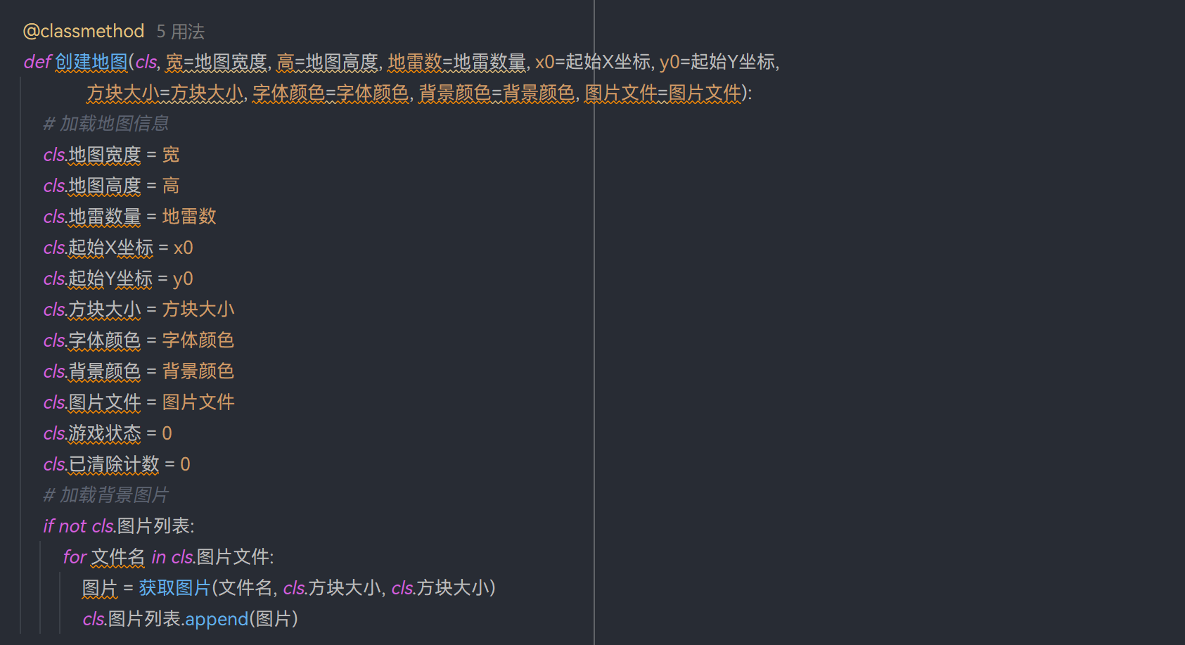 (4)def creat_map创建游戏地图的配置,如高度、宽度、地雷数量等,并加载背景图片