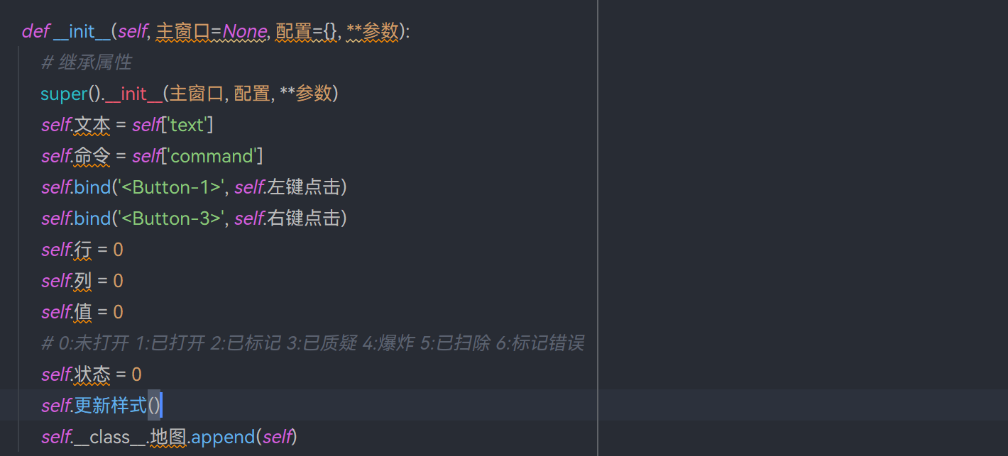 (7)def init(self, 主窗口=None, 配置={}, **参数),为扫雷游戏中的方块设置基本属性、绑定交互事件、初始化状态,将其纳入游戏地图管理。