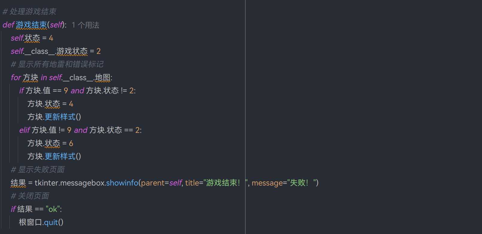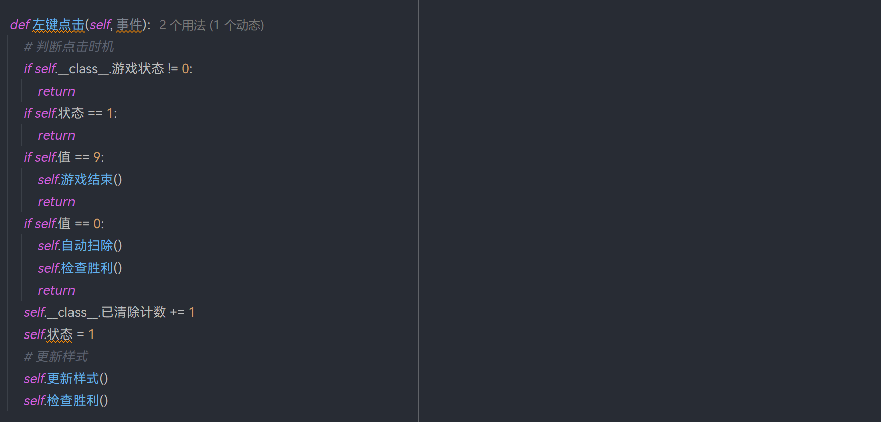 (8)def clicked(self,event)处理左键点击,打开方块或触发游戏结束;