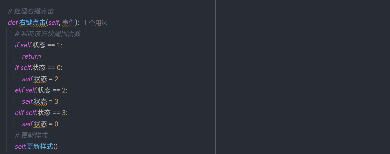 def right_clicked(self,event)处理右键点击,切换方块的标记状态。支持无标记、标记为雷、质疑三种状态之间的转换;