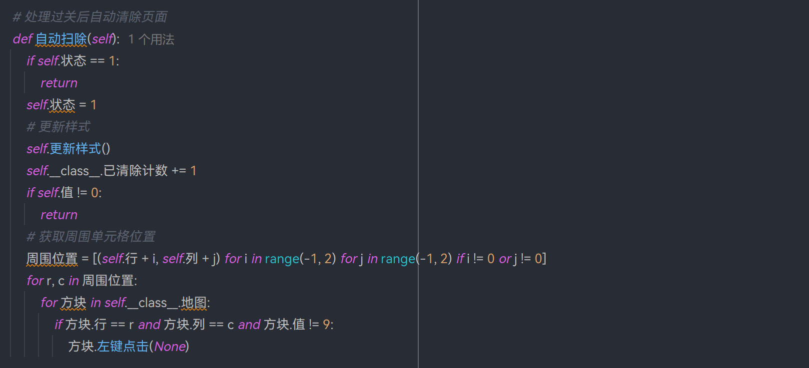 def auto_sweep(self)实现自动清扫功能,当玩家打开一个周围没有地雷的方块时,相应地打开周围的空白方块 ;