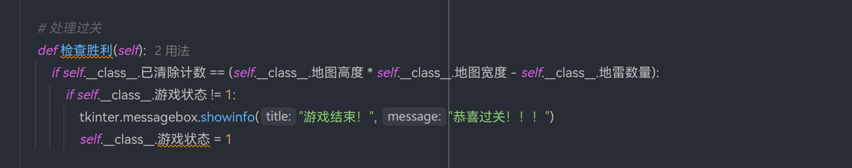 if self.__class__.已清除计数 == (self.__class__.地图高度 * self.__class__.地图宽度 - self.__class__.地雷数量):