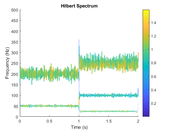 频率对时间图是一个稀疏图,其中垂直颜色条表示IMF中每个点的瞬时能量。该图表示从原始混合信号分解的每个分量的瞬时频谱。从该图中可以观察到三个IMF,其频率在1s处有明显变化。