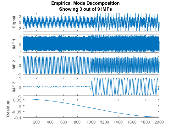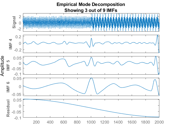 使用该图可视化从原始信号中分解的各个组件以及残差。请注意,残差是根据IMF总数计算的,并且不会根据IMF选择器窗口中选择的IMF进行更改。