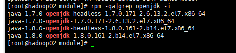 [root@hadoop02 module]# rpm -e --nodeps java-1.7.0-openjdk-headless-1.7.0.171-2.6.13.2.el7.x86_64 [root@hadoop02 module]# rpm -e --nodeps java-1.7.0-openjdk-1.7.0.171-2.6.13.2.el7.x86_64 [root@hadoop02 module]# rpm -e --nodeps java-1.8.0-openjdk-headless-1.8.0.161-2.b14.el7.x86_64 [root@hadoop02 module]# rpm -e --nodeps java-1.8.0-openjdk-1.8.0.161-2.b14.el7.x86_64 [root@hadoop02 module]# rpm -qa|grep openjdk -i [root@hadoop02 module]# java -version -bash: /usr/bin/java: 没有那个文件或目录 [root@hadoop02 module]#