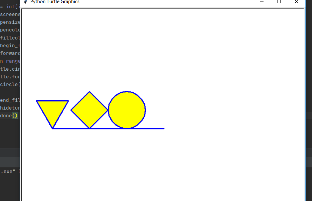 import turtle number = int(input()) turtle.screensize(600,500,'white') turtle.pensize(3) turtle.pencolor('blue') turtle.fillcolor('yellow') turtle.begin_fill() turtle.forward(-300) for i in range(3,number): turtle.circle(50, steps=i) turtle.forward(100) turtle.circle(50) turtle.end_fill() turtle.hideturtle() turtle.done()