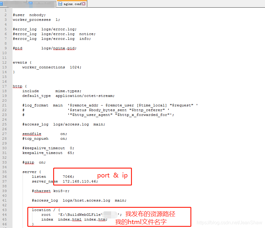 使用编辑器打开这个文件,修改里面的内容,一个是ip和port,一个是自己的资源文件路径,包括html文件名称