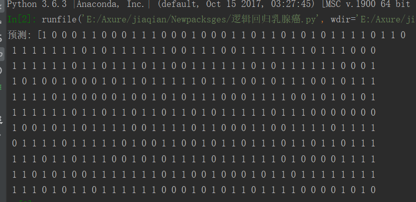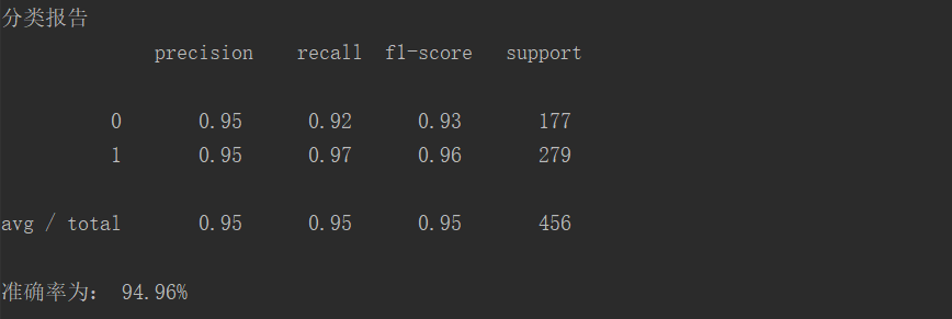 from sklearn.datasets import load_breast_cancer from sklearn.linear_model import LogisticRegression from sklearn.model_selection import train_test_split from sklearn.metrics import classification_report data = load_breast_cancer() x = data.data y = data.target #划分训练和测试集 x_train, x_test, y_train, y_test= train_test_split(x , y , test_size=0.8) #构建模型病训练模型 model_LR = LogisticRegression() model_LR.fit(x_train,y_train) #模型预测 y_pre = model_LR.predict(x_test) print('预测:', y_pre) print('真实:', y_test) print('分类报告\n', classification_report(y_test, y_pre)) print('准确率为: {0:.2f}%'.format(model_LR.score(x_test,y_test)*100))