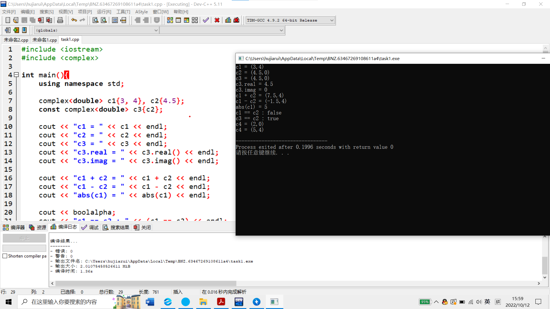 #include <iostream> #include <complex> int main(){ using namespace std; complex<double> c1{3, 4}, c2{4.5}; const complex<double> c3{c2}; cout << "c1 = " << c1 << endl; cout << "c2 = " << c2 << endl; cout << "c3 = " << c3 << endl; cout << "c3.real = " << c3.real() << endl; cout << "c3.imag = " << c3.imag() << endl; cout << "c1 + c2 = " << c1 + c2 << endl; cout << "c1 - c2 = " << c1 - c2 << endl; cout << "abs(c1) = " << abs(c1) << endl; cout << boolalpha; cout << "c1 == c2 : " << (c1 == c2) << endl; cout << "c3 == c2 : " << (c3 == c2) << endl; complex<double> c4 = 2; cout << "c4 = " << c4 << endl; c4 += c1; cout << "c4 = " << c4 << endl; }