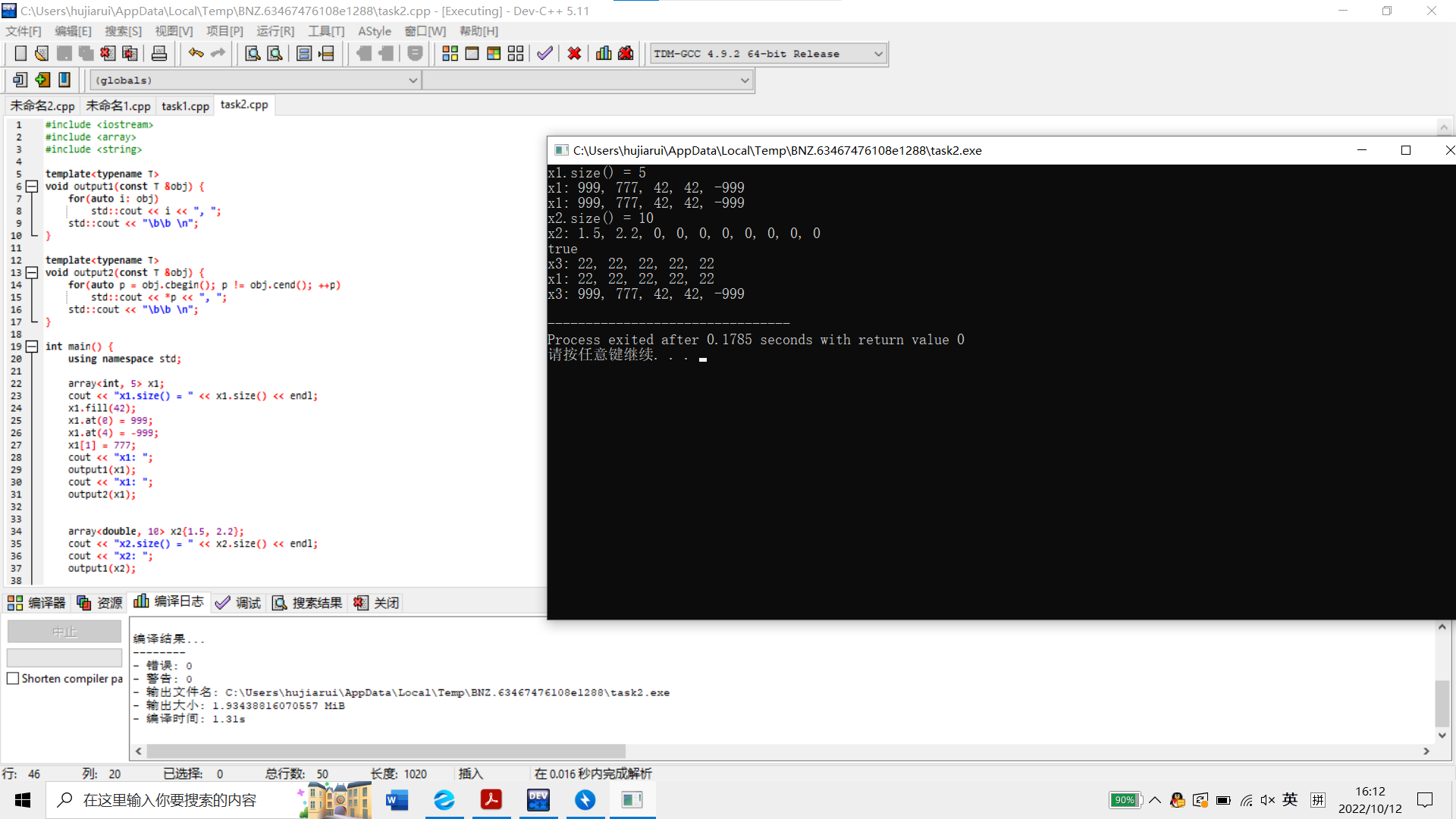 #include <iostream> #include <array> #include <string> template<typename T> void output1(const T &obj) { for(auto i: obj) std::cout << i << ", "; std::cout << "\b\b \n"; } template<typename T> void output2(const T &obj) { for(auto p = obj.cbegin(); p != obj.cend(); ++p) std::cout << *p << ", "; std::cout << "\b\b \n"; } int main() { using namespace std; array<int, 5> x1; cout << "x1.size() = " << x1.size() << endl; x1.fill(42); x1.at(0) = 999; x1.at(4) = -999; x1[1] = 777; cout << "x1: "; output1(x1); cout << "x1: "; output2(x1); array<double, 10> x2{1.5, 2.2}; cout << "x2.size() = " << x2.size() << endl; cout << "x2: "; output1(x2); array<int, 5> x3(x1); cout << boolalpha << (x1 == x3) << endl; x3.fill(22); cout << "x3: "; output1(x3); swap(x1, x3); cout << "x1: "; output1(x1); cout << "x3: "; output1(x3); }
