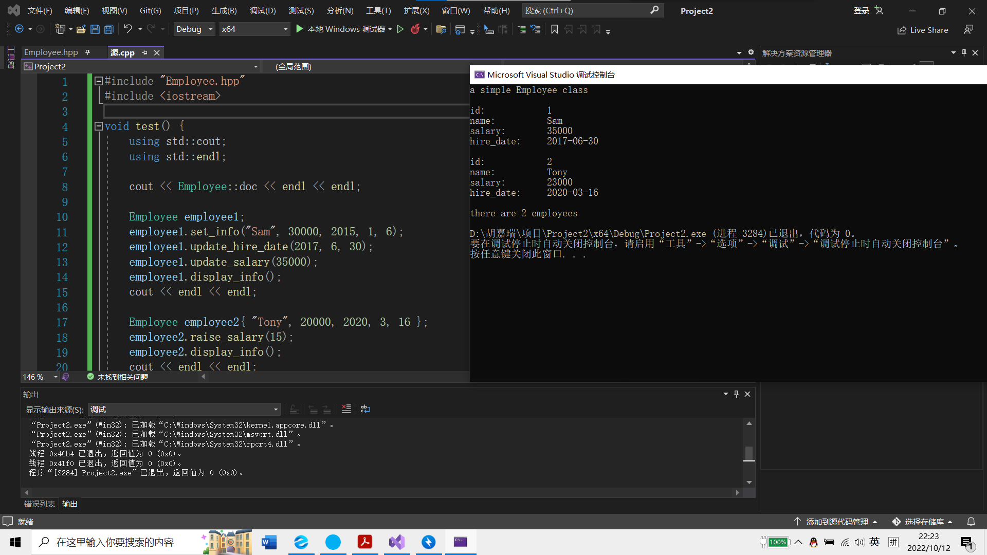 #include "Employee.hpp" #include <iostream> void test() { using std::cout; using std::endl; cout << Employee::doc << endl << endl; Employee employee1; employee1.set_info("Sam", 30000, 2015, 1, 6); employee1.update_hire_date(2017, 6, 30); employee1.update_salary(35000); employee1.display_info(); cout << endl << endl; Employee employee2{ "Tony", 20000, 2020, 3, 16 }; employee2.raise_salary(15); employee2.display_info(); cout << endl << endl; Employee::display_count(); } int main() { test(); } #pragma once #pragma once #include <iostream> #include <string> #include <iomanip> using std::string; using std::cout; using std::endl; using std::setfill; using std::setw; using std::left; using std::right; using std::to_string; struct Date { int year; int month; int day; }; class Employee { public: Employee(); Employee(string name0, double salary0, int y, int m, int d = 1); void set_info(string name0, double salary0, int y, int m, int d = 1); string get_name() const; double get_salary() const; void display_info() const; void update_salary(double s); void update_hire_date(int y, int m, int d); void raise_salary(double by_percent); public: static void display_count(); private: string id; string name; double salary; Date hire_date; public: static const string doc; private: static int count; }; const string Employee::doc{ "a simple Employee class" }; int Employee::count = 0; Employee::Employee() : id{ to_string(count + 1) } { ++count; } Employee::Employee(string name0, double salary0, int y, int m, int d) : id{ to_string(count + 1) }, name{ name0 }, salary{ salary0 }, hire_date{ y, m, d } { ++count; } void Employee::set_info(string name0, double salary0, int y, int m, int d) { name = name0; salary = salary0; hire_date.year = y; hire_date.month = m; hire_date.day = d; } string Employee::get_name() const { return name; } double Employee::get_salary() const { return salary; } void Employee::display_info() const { cout << left << setw(15) << "id: " << id << endl; cout << setw(15) << "name: " << name << endl; cout << setw(15) << "salary: " << salary << endl; cout << setw(15) << "hire_date: " << hire_date.year << "-"; cout << std::right << setfill('0') << setw(2) << hire_date.month << "-" << setw(2) << hire_date.day; cout << setfill(' '); } void Employee::update_salary(double s) { salary = s; } void Employee::update_hire_date(int y, int m, int d) { hire_date.year = y; hire_date.month = m; hire_date.day = d; } void Employee::raise_salary(double by_percent) { double raise = salary * by_percent / 100; salary += raise; } void Employee::display_count() { cout << "there are " << count << " employees\n"; }