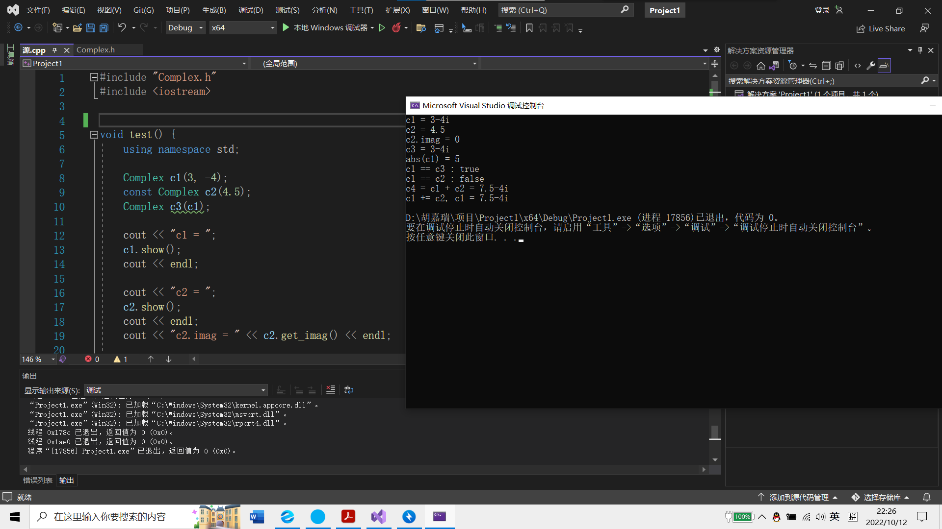 #include "Complex.h" #include <iostream> void test() { using namespace std; Complex c1(3, -4); const Complex c2(4.5); Complex c3(c1); cout << "c1 = "; c1.show(); cout << endl; cout << "c2 = "; c2.show(); cout << endl; cout << "c2.imag = " << c2.get_imag() << endl; cout << "c3 = "; c3.show(); cout << endl; cout << "abs(c1) = "; cout << abs(c1) << endl; cout << boolalpha; cout << "c1 == c3 : " << is_equal(c1, c3) << endl; cout << "c1 == c2 : " << is_equal(c1, c2) << endl; Complex c4; c4 = add(c1, c2); cout << "c4 = c1 + c2 = "; c4.show(); cout << endl; c1.add(c2); cout << "c1 += c2, " << "c1 = "; c1.show(); cout << endl; } int main() { test(); } #pragma once #include<iostream> #include<cmath> using namespace std; class Complex { public: Complex(float x = 0, float y = 0) { real = x; imag = y; } Complex(Complex& c1); int get_real()const { return real; } int get_imag()const { return imag; } friend Complex add(Complex& c1, const Complex& c2); friend bool is_equal(const Complex& c1, const Complex& c2); friend float abs(Complex& c1); void show()const; void add( const Complex& c1); private: float real, imag; }; Complex::Complex(Complex& c1) { real = c1.real; imag = c1.imag; } void Complex::show()const { if (imag == 0) cout << real; else if (imag < 0) cout << real << "-" << abs(imag) << "i"; else cout << real << "+" << imag << "i"; } void Complex::add(const Complex& c1) { real += c1.real; imag += c1.imag; } Complex add(Complex& c1,const Complex& c2) { Complex c3; c3.real = c1.real + c2.real; c3.imag = c1.imag + c2.imag; return c3; } bool is_equal(const Complex& c1,const Complex& c2) { if (c1.real == c2.real && c1.imag == c2.imag) return true; else return false; } float abs(Complex& c1) { return sqrt(c1.real * c1.real + c1.imag * c1.imag); }