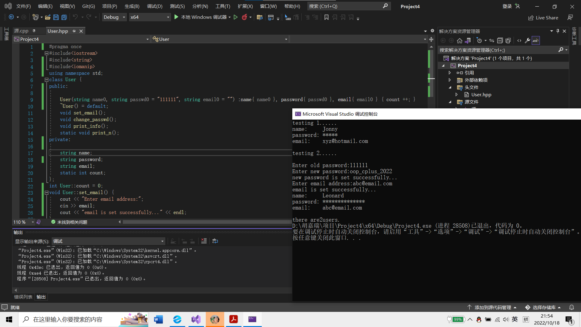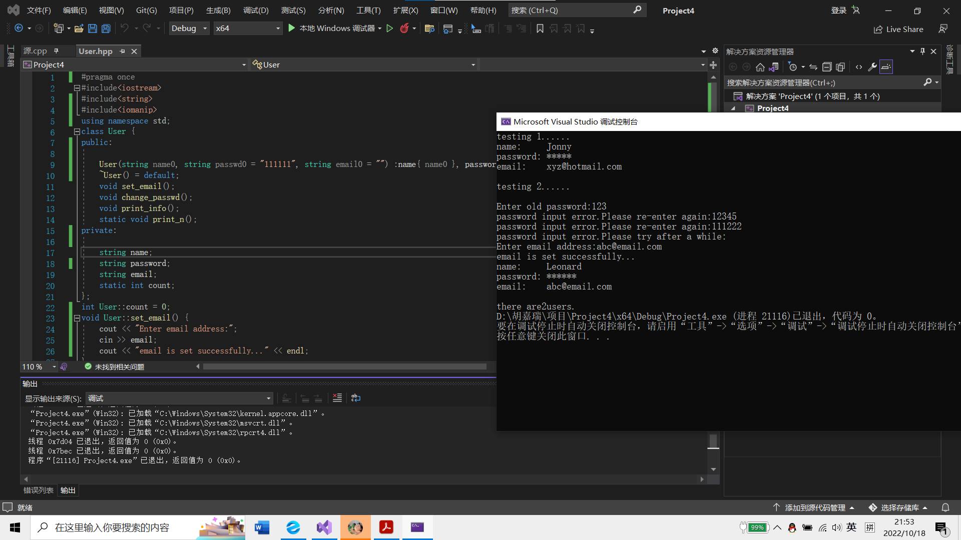 #pragma once #include<iostream> #include<string> #include<iomanip> using namespace std; class User { public: User(string name0, string passwd0 = "111111", string email0 = "") :name{ name0 }, password{ passwd0 }, email{ email0 } { count ++; } ~User() = default; void set_email(); void change_passwd(); void print_info(); static void print_n(); private: string name; string password; string email; static int count; }; int User::count = 0; void User::set_email() { cout << "Enter email address:"; cin >> email; cout << "email is set successfully..." << endl; } void User::change_passwd() { for (int i = 1; i <= 3; i++) { string password1; if (i == 1) cout << "Enter old password:"; cin >> password1; if (password1 == password) { cout << "Enter new password:"; cin >> password; cout << "new password is set successfully..." << endl; break; } else { if (i == 1 || i == 2) cout << "password input error.Please re-enter again:"; if(i==3) cout << "password input error.Please try after a while:" << endl; } } } void User::print_info() { cout <<left<<setw(10) << "name:" << name << endl; cout << setw(10) << "password:" ; for (int j = 0; j <password.length(); j++) cout << "*"; cout << endl; cout <<setw(10) << "email:" << email << endl; } void User::print_n() { cout << "there are" << count << "users."; }