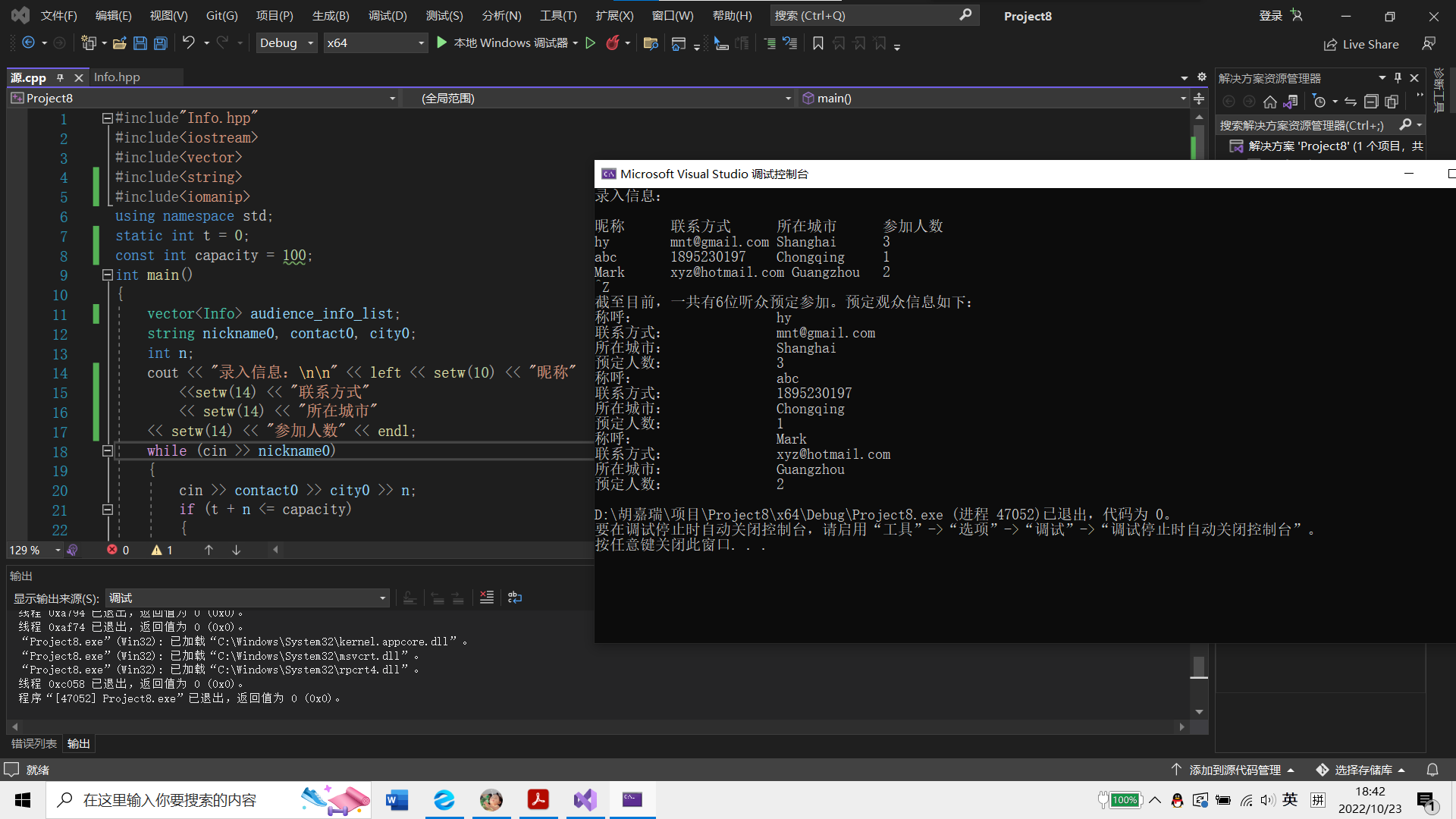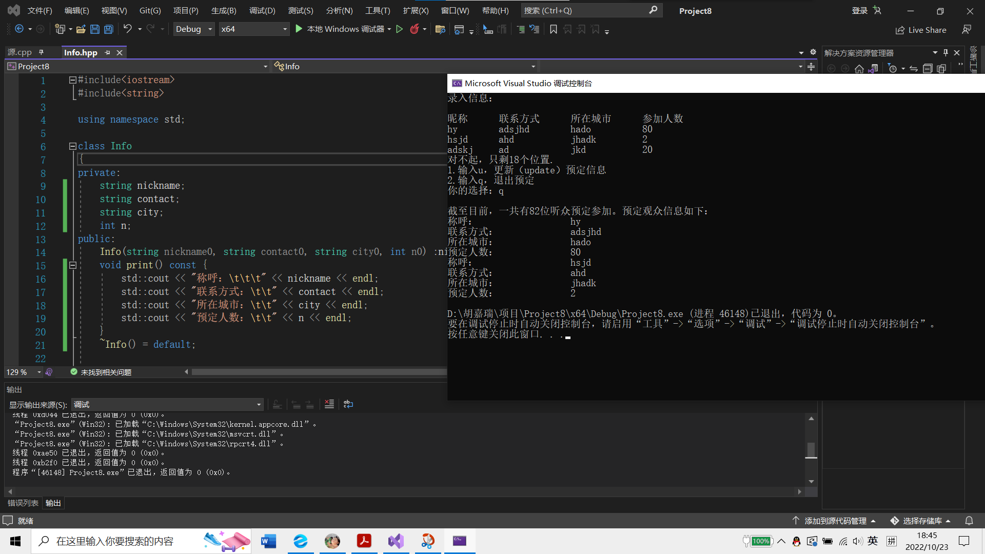 #include"Info.hpp" #include<iostream> #include<vector> #include<string> #include<iomanip> using namespace std; static int t = 0; const int capacity = 100; int main() { vector<Info> audience_info_list; string nickname0, contact0, city0; int n; cout << "录入信息:\n\n" << left << setw(10) << "昵称" <<setw(14) << "联系方式" << setw(14) << "所在城市" << setw(14) << "参加人数" << endl; while (cin >> nickname0) { cin >> contact0 >> city0 >> n; if (t + n <= capacity) { Info tmp(nickname0, contact0, city0, n); audience_info_list.push_back(tmp); t += n; if (t == capacity) break; } else { cout << "对不起,只剩" << capacity - t << "个位置." << endl << "1.输入u,更新(update)预定信息" << endl << "2.输入q,退出预定" << endl << "你的选择:"; char ch; cin >> ch; if (ch == 'u') cout << "请重新输入:" << endl; else { cout << endl; break; } } } cout << "截至目前,一共有" << t << "位听众预定参加。预定观众信息如下:" << endl; for (auto& list : audience_info_list) list.print(); return 0; }