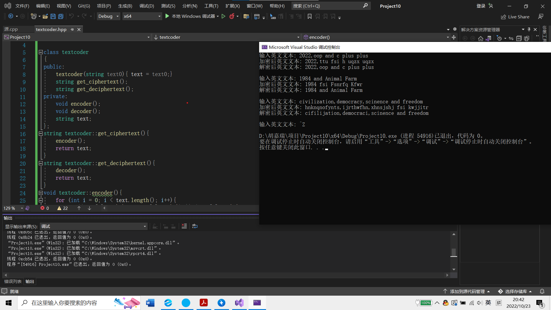 #include<iostream> #include<string> using namespace std; class textcoder { public: textcoder(string text0){ text = text0;} string get_ciphertext(); string get_deciphertext(); private: void encoder(); void decoder(); string text; }; string textcoder::get_ciphertext(){ encoder(); return text; } string textcoder::get_deciphertext(){ decoder(); return text; } void textcoder::encoder(){ for (int i = 0; i < text.length(); i++){ if ((text[i] >= 'a' && text[i] <= 'u') || (text[i] >= 'A' && text[i] <= 'U')){ text[i] += 5; } else if ((text[i] >= 'v' && text[i] <= 'z') || (text[i] >= 'V' && text[i] <= 'Z')) { text[i] -= 21; } } } void textcoder::decoder() { for (int i = 0; i < text.length(); i++) { if ((text[i] >= 'a' && text[i] <= 'e') || (text[i] >= 'A' && text[i] <= 'E')) { text[i] += 21; } else if ((text[i] >= 'f' && text[i] <= 'z') || (text[i] >= 'F' && text[i] <= 'Z')) { text[i] -= 5; } } }
