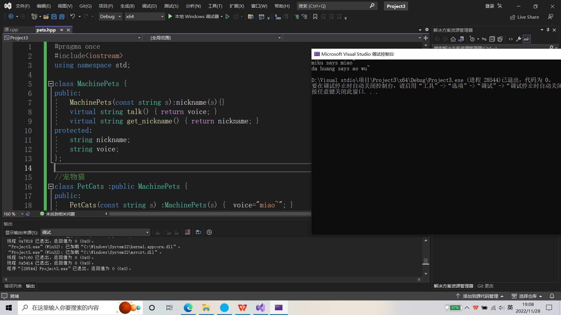 #include <iostream> #include "pets.hpp" void play(MachinePets &obj){ std::cout << obj.get_nickname() << " says " << obj.talk() << std::endl; } void test() { PetCats cat("miku"); PetDogs dog("da huang"); play(cat); play(dog); } int main() { test(); }