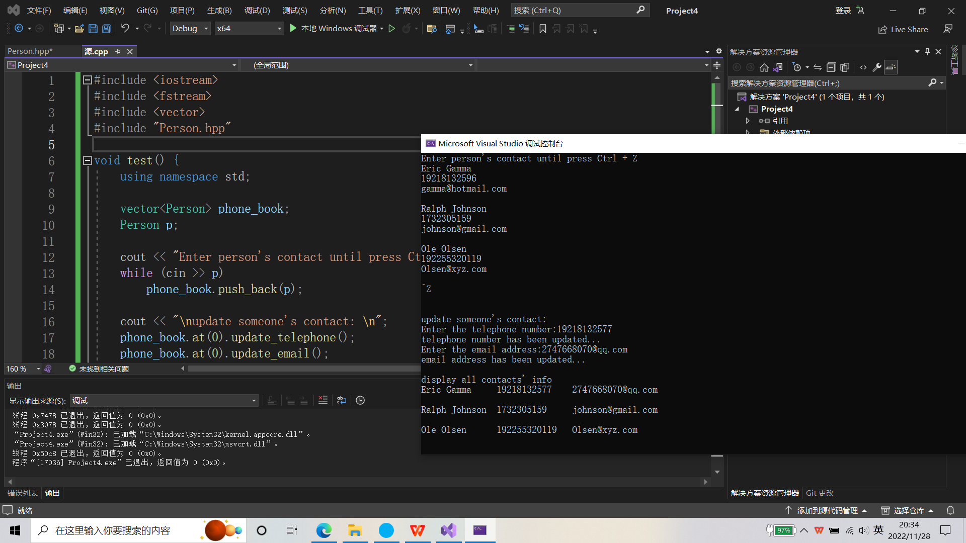 #include <iostream> #include <fstream> #include <vector> #include "Person.hpp" void test() { using namespace std; vector<Person> phone_book; Person p; cout << "Enter person's contact until press Ctrl + Z" << endl; while (cin >> p) phone_book.push_back(p); cout << "\nupdate someone's contact: \n"; phone_book.at(0).update_telephone(); phone_book.at(0).update_email(); cout << "\ndisplay all contacts' info\n"; for (auto& phone : phone_book) cout << phone << endl; cout << "\ntest whether the same contact\n"; cout << boolalpha << (phone_book.at(0) == phone_book.at(1)) << endl; } int main() { test(); }