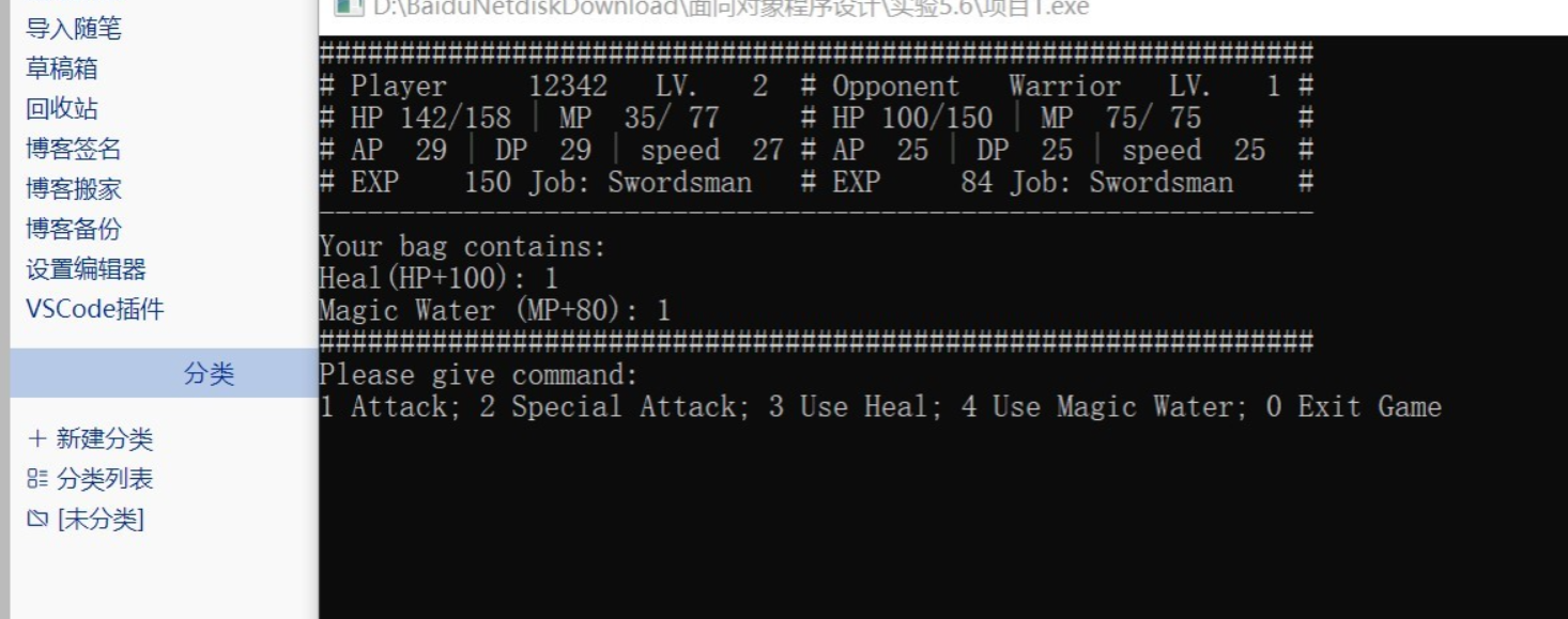 //======================= // main.cpp //======================= // main function for the RPG style game #include <iostream> #include <string> using namespace std; #include "swordsman.h" int main() { string tempName; bool success = 0; //flag for storing whether operation is successful cout << "Please input player's name: "; cin >> tempName; // get player's name from keyboard input player* human; // use pointer of base class, convenience for polymorphism int tempJob; // temp choice for job selection do { cout << "Please choose a job: 1 Swordsman, 2 Archer, 3 Mage" << endl; cin >> tempJob; system("cls"); // clear the screen switch (tempJob) { case 1: human = new swordsman(1, tempName); // create the character with user inputted name and job success = 1; // operation succeed break; default: break; // In this case, success=0, character creation failed } } while (success != 1); // so the loop will ask user to re-create a character int tempCom; // temp command inputted by user int nOpp = 0; // the Nth opponent for (int i = 1; nOpp < 5; i += 2) // i is opponent's level { nOpp++; system("cls"); cout << "STAGE" << nOpp << endl; cout << "Your opponent, a Level " << i << " Swordsman." << endl; system("pause"); swordsman enemy(i, "Warrior"); // Initialise an opponent, level i, name "Junior" human->reFill(); // get HP/MP refill before start fight while (!human->death() && !enemy.death()) // no died { success = 0; while (success != 1) { showinfo(*human, enemy); // show fighter's information cout << "Please give command: " << endl; cout << "1 Attack; 2 Special Attack; 3 Use Heal; 4 Use Magic Water; 0 Exit Game" << endl; cin >> tempCom; switch (tempCom) { case 0: cout << "Are you sure to exit? Y/N" << endl; char temp; cin >> temp; if (temp == 'Y' || temp == 'y') return 0; else break; case 1: success = human->attack(enemy); human->isLevelUp(); enemy.isDead(); break; case 2: success = human->specialatt(enemy); human->isLevelUp(); enemy.isDead(); break; case 3: success = human->useHeal(); break; case 4: success = human->useMW(); break; default: break; } } if (!enemy.death()) // If AI still alive enemy.AI(*human); else // AI died { cout << "YOU WIN" << endl; human->transfer(enemy); // player got all AI's items } if (human->death()) { system("cls"); cout << endl << setw(50) << "GAME OVER" << endl; delete human; // player is dead, program is getting to its end, what should we do here? system("pause"); return 0; } } } delete human; // You win, program is getting to its end, what should we do here? system("cls"); cout << "Congratulations! You defeated all opponents!!" << endl; system("pause"); return 0; }