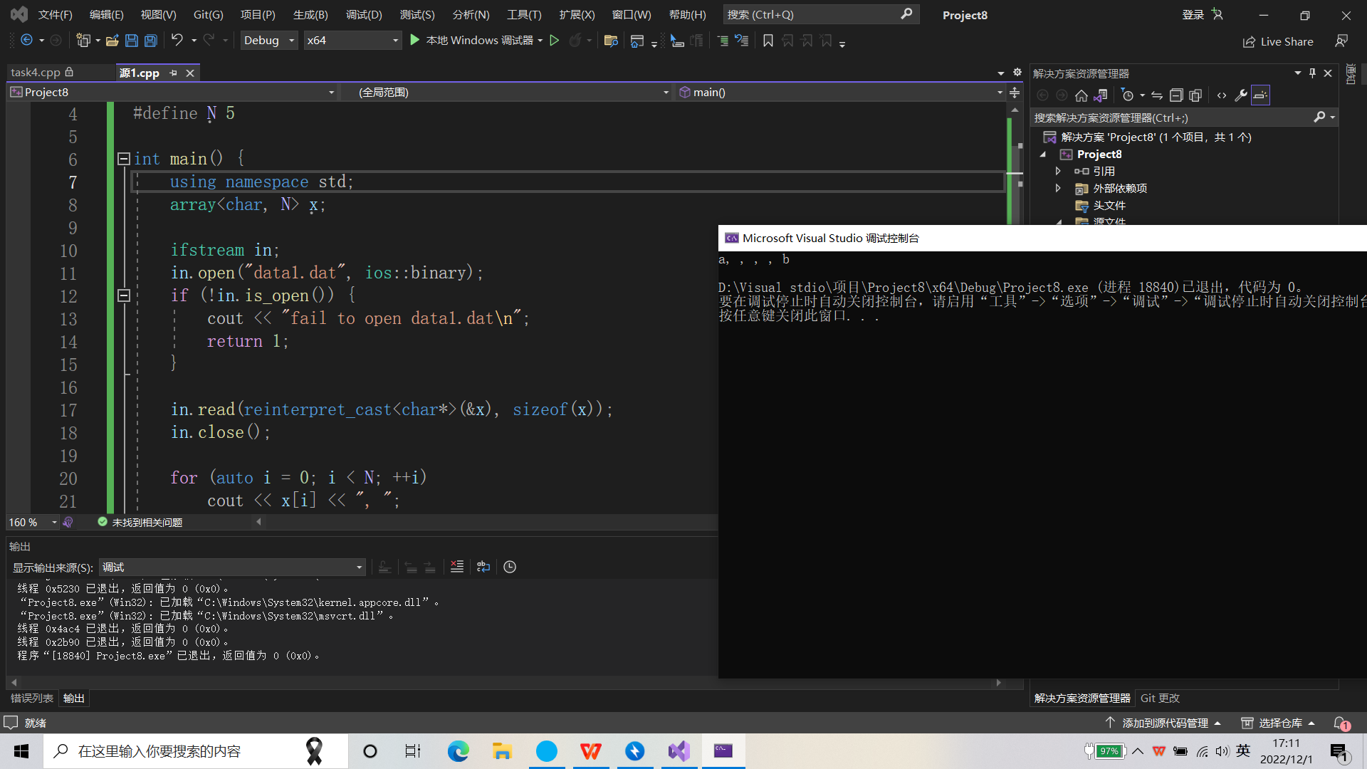 #include <iostream> #include "Vector.hpp" void test() { using namespace std; int n; cin >> n; Vector<double> x1(n); for (auto i = 0; i < n; ++i) x1.at(i) = i * 0.7; output(x1); Vector<int> x2(n, 42); Vector<int> x3(x2); output(x2); output(x3); x2.at(0) = 77; output(x2); x3[0] = 999; output(x3); } int main() { test(); }