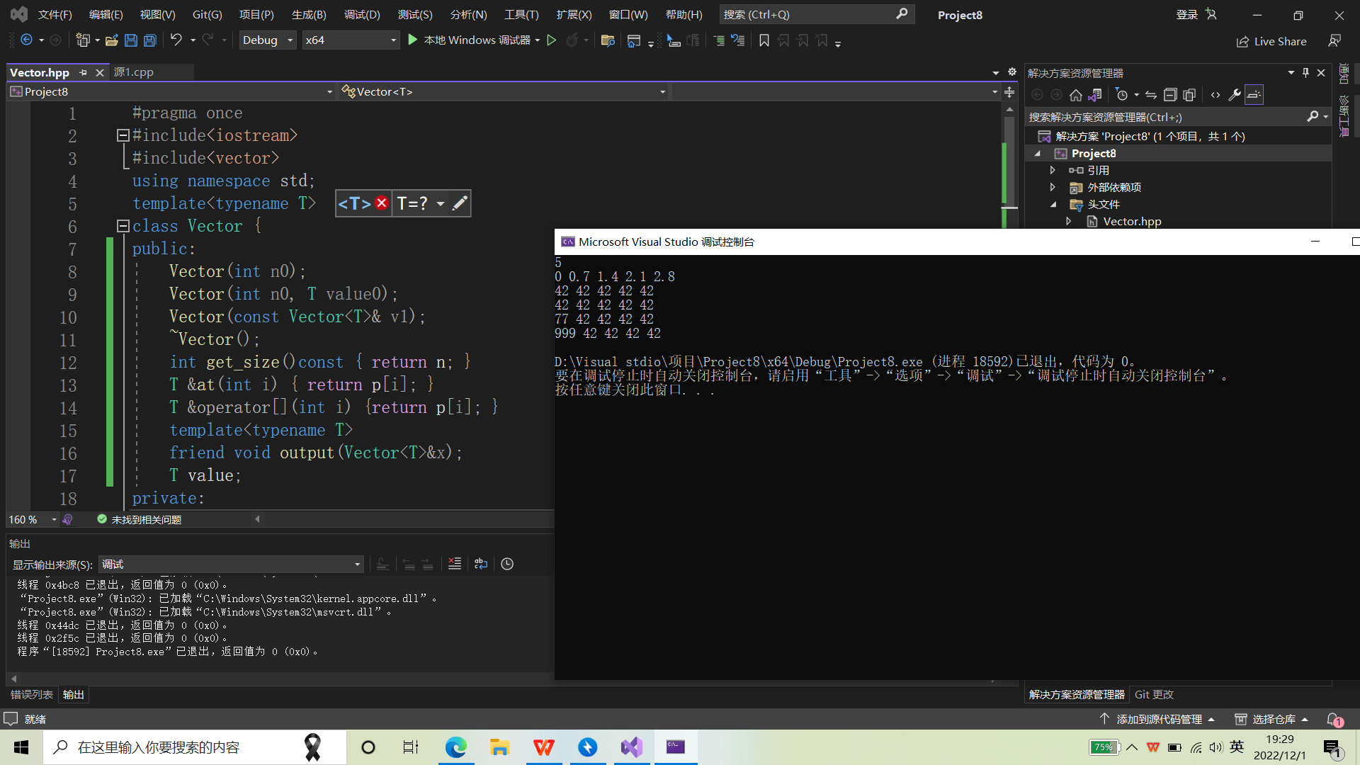 #pragma once #include<iostream> #include<vector> using namespace std; template<typename T> class Vector { public: Vector(int n0); Vector(int n0, T value0); Vector(const Vector<T>& v1); ~Vector(); int get_size()const { return n; } T &at(int i) { return p[i]; } T &operator[](int i) {return p[i]; } template<typename T> friend void output(Vector<T>&x); T value; private: int n; T *p; }; template<typename T> Vector<T>::Vector(int n0) { n = n0; p = new T[n]; } template<typename T> Vector<T>::Vector(int n0,T value0){ n = n0; value = value0; p = new T[n]; for (auto i = 0; i < n; i++) p[i] = value; } template<typename T> Vector<T>::Vector(const Vector<T>& v1) { n = v1.n; p = new T[n]; for (int i = 0; i < n; i++) { p[i] = v1.p[i]; } } template<typename T> Vector<T>::~Vector(){ delete p; } template<typename T> void output(Vector<T>& x) { for (int i = 0; i < x.n; i++) cout << x.at(i) << ' '; cout << endl; }