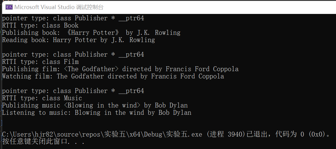 #include "publisher.hpp" #include <vector> #include <typeinfo> using std::vector; void test() { vector<Publisher *> v; v.push_back(new Book("Harry Potter", "J.K. Rowling")); v.push_back(new Film("The Godfather", "Francis Ford Coppola")); v.push_back(new Music("Blowing in the wind", "Bob Dylan")); for(auto &ptr: v) { cout << "pointer type: " << typeid(ptr).name() << endl; // 输出指针类型 cout << "RTTI type: " << typeid(*ptr).name() << endl; // 输出指针指向的对象类型 ptr->publish(); ptr->use(); cout << endl; } } int main() { test(); }