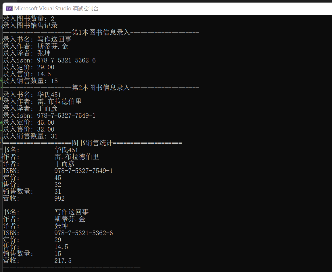 #include "booksale.hpp" #include <iostream> #include <string> #include <vector> #include <algorithm> // 按图书销售数额比较 bool compare_by_amount(const BookSale& x1, const BookSale& x2) { return x1.get_amount() > x2.get_amount(); } void test() { using namespace std; vector<BookSale> sales_lst; // 存放图书销售记录 int books_number; cout << "录入图书数量: "; cin >> books_number; cout << "录入图书销售记录" << endl; for (int i = 0; i < books_number; ++i) { string name, author, translator, isbn; float price; cout << string(20, '-') << "第" << i + 1 << "本图书信息录入" << string(20, '-') << endl; cout << "录入书名: "; cin >> name; cout << "录入作者: "; cin >> author; cout << "录入译者: "; cin >> translator; cout << "录入isbn: "; cin >> isbn; cout << "录入定价: "; cin >> price; Book book(name, author, translator, isbn, price); float sales_price; int sales_amount; cout << "录入售价: "; cin >> sales_price; cout << "录入销售数量: "; cin >> sales_amount; BookSale record(book, sales_price, sales_amount); sales_lst.push_back(record); } // 按销售册数排序 sort(sales_lst.begin(), sales_lst.end(), compare_by_amount); // 按销售册数降序输出图书销售信息 cout << string(20, '=') << "图书销售统计" << string(20, '=') << endl; for (auto& t : sales_lst) { cout << t << endl; cout << string(40, '-') << endl; } } int main() { test(); }
