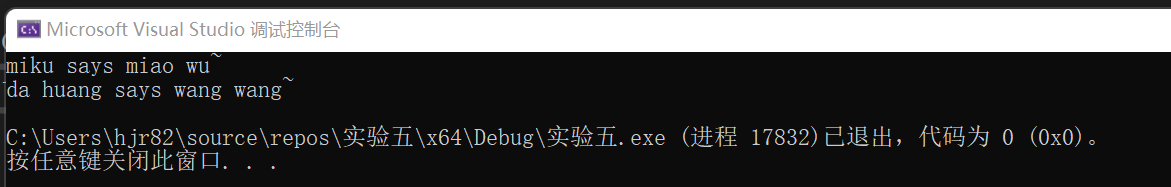 #include<iostream> #include<string> using std::endl; using std::cout; using std::string; using std::ostream; class MachinePets { public: MachinePets(const string &s); string get_nickname()const; friend ostream& operator<<(ostream& out, const MachinePets&); public: virtual void talk() const = 0; protected: string nickname; }; MachinePets::MachinePets(const string &s):nickname(s){} string MachinePets::get_nickname() const { return nickname; } ostream& operator<<(ostream& out, const MachinePets& m) { out << m.get_nickname()<<" says "; m.talk(); return out; } class PetCats:public MachinePets { public: PetCats(const string& a); public: virtual void talk() const override; private: string catname; }; PetCats::PetCats(const string& a) :MachinePets(a),catname(a){} void PetCats::talk() const { cout<<"miao wu~"; } class PetDogs :public MachinePets { public: PetDogs(const string& d); public: virtual void talk() const override; private: string dogname; }; PetDogs::PetDogs(const string& d) :MachinePets(d),dogname(d){} void PetDogs::talk() const { cout <<"wang wang~"; }
