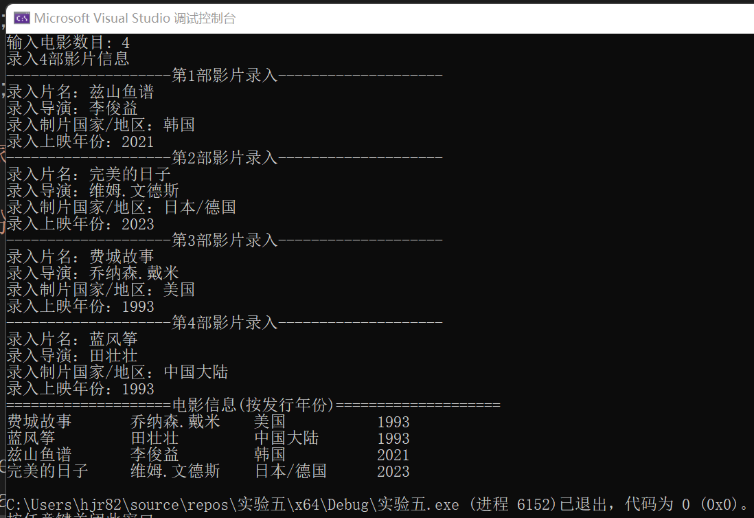 #include "film.hpp" #include <iostream> #include <string> #include <vector> #include <algorithm> void test() { using namespace std; int n; cout << "输入电影数目: "; cin >> n; cout << "录入" << n << "部影片信息" << endl; vector<Film> film_lst; for (int i = 0; i < n; ++i) { Film f; cout << string(20, '-') << "第" << i + 1 << "部影片录入" << string(20, '-') << endl; cin >> f; film_lst.push_back(f); } // 按发行年份升序排序 sort(film_lst.begin(), film_lst.end(), compare_by_year); cout << string(20, '=') + "电影信息(按发行年份)" + string(20, '=') << endl; for (auto& f : film_lst) cout << f << endl; } int main() { test(); }
