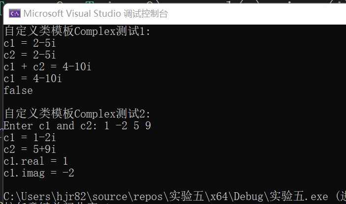 #include "Complex.hpp" #include <iostream> using std::cin; using std::cout; using std::endl; using std::boolalpha; void test1() { Complex<int> c1(2, -5), c2(c1); cout << "c1 = " << c1 << endl; cout << "c2 = " << c2 << endl; cout << "c1 + c2 = " << c1 + c2 << endl; c1 += c2; cout << "c1 = " << c1 << endl; cout << boolalpha << (c1 == c2) << endl; } void test2() { Complex<double> c1, c2; cout << "Enter c1 and c2: "; cin >> c1 >> c2; cout << "c1 = " << c1 << endl; cout << "c2 = " << c2 << endl; cout << "c1.real = " << c1.get_real() << endl; cout << "c1.imag = " << c1.get_imag() << endl; } int main() { cout << "自定义类模板Complex测试1: " << endl; test1(); cout << endl; cout << "自定义类模板Complex测试2: " << endl; test2(); }
