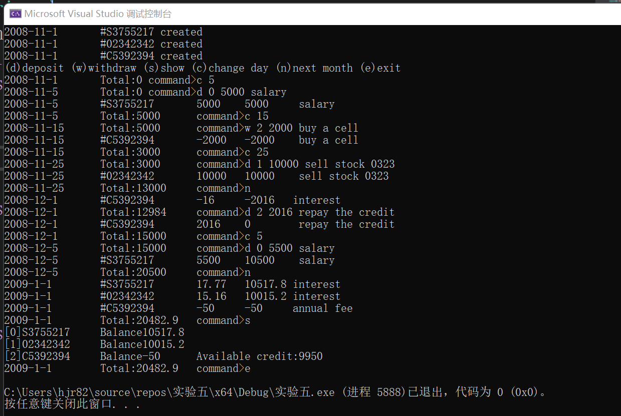 #include"account.h" #include<iostream> using namespace std; int main() { Date date(2008, 11, 1); SavingsAccount sa1(date, "S3755217", 0.015); SavingsAccount sa2(date, "02342342", 0.015); CreditAccount ca(date, "C5392394", 10000, 0.0005, 50); Account* accounts[] = { &sa1,&sa2,&ca }; const int n = sizeof(accounts) / sizeof(Account*); cout << "(d)deposit (w)withdraw (s)show (c)change day (n)next month (e)exit" << endl; char cmd; do { date.show(); cout << "\tTotal:" << Account::getTotal() << "\tcommand>"; int index, day; double amount; string desc; cin >> cmd; switch (cmd) { case 'd': cin >> index >> amount; getline(cin, desc); accounts[index]->deposit(date, amount, desc); break; case 'w': cin >> index >> amount; getline(cin, desc); accounts[index]->withdraw(date, amount, desc); break; case 's': for (int i = 0;i < n;i++) { cout << "[" << i << "]"; accounts[i]->show(); cout << endl; } break; case 'c': cin >> day; if (day < date.getDay()) cout << "You cannot specify a previous day"; else if (day > date.getMaxDay()) cout << "Inalid day"; else date = Date(date.getYear(), date.getMonth(), day); break; case 'n': if (date.getMonth() == 12) date = Date(date.getYear() + 1, 1, 1); else date = Date(date.getYear(), date.getMonth() + 1, 1); for (int i = 0;i < n;i++) accounts[i]->settle(date); break; } }while (cmd != 'e'); return 0; }