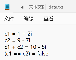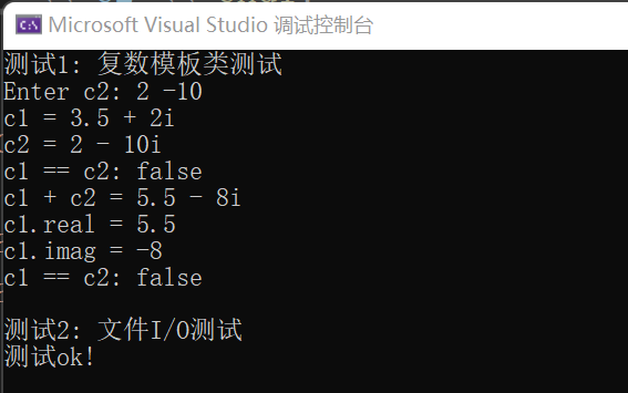 #include "Complex.hpp" #include <iostream> #include <fstream> #include <stdexcept> void test1(); void test2(); int main() { using namespace std; cout << "测试1: 复数模板类测试" << endl; test1(); cout << "\n测试2: 文件I/O测试" << endl; test2(); } void test1() { using namespace std; Complex<double> c1{3.5, 2}, c2; cout << "Enter c2: "; cin >> c2; cout << "c1 = " << c1 << endl; cout << "c2 = " << c2 << endl; cout << "c1 == c2: " << boolalpha << (c1 == c2) << endl; cout << "c1 + c2 = " << c1 + c2 << endl; c1 += c2; cout << "c1.real = " << c1.get_real() << endl; cout << "c1.imag = " << c1.get_imag() << endl; cout << "c1 == c2: " << boolalpha << (c1 == c2) << endl; } void test2() { using namespace std; Complex<int> c1{1, 2}, c2{9, -7}; ofstream out("ans.txt"); if(!out.is_open()) { cout << "fail to open file ans.txt to write\n"; return; } out << "c1 = " << c1 << endl; out << "c2 = " << c2 << endl; out << "c1 + c2 = " << c1 + c2 << endl; out << "(c1 == c2) = " << boolalpha << (c1 == c2) << endl; out.close(); cout << "测试ok!" << endl; }
