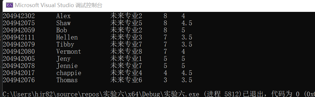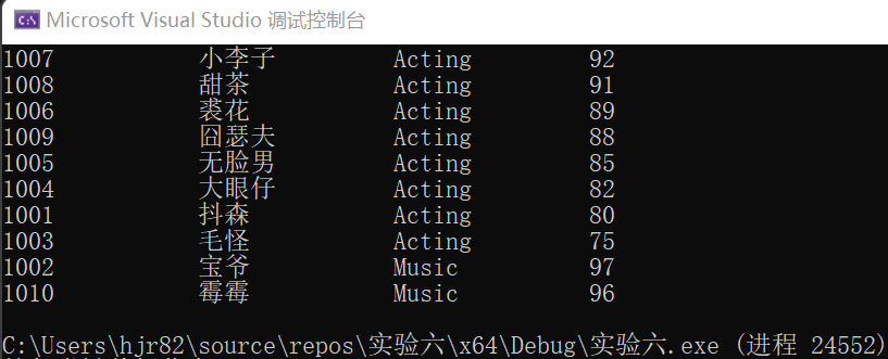 #include <iostream> #include <iomanip> #include <string> #include <vector> #include <fstream> #include <algorithm> using std::string; using std::ostream; using std::istream; using std::setw; using std::setprecision; using std::setiosflags; using std::ios_base; using std::vector; class Student { private: string number; string name; string major; int score; public: Student() = default; Student(const string& num, const string& name, const string& major, int score) : number(num), name(name), major(major), score(score) {} ~Student() = default; int get_score() const { return score; } const string& get_major() const { return major; } friend ostream& operator<<(ostream& out, const Student& s); friend istream& operator>>(istream& in, Student& s); }; ostream& operator<<(ostream& out, const Student& s) { out << setiosflags(ios_base::left); out << setw(15) << s.number << setw(15) << s.name << setw(15) << s.major << setw(5) << s.score; return out; } istream& operator>>(istream& in, Student& s) { in >> s.number >> s.name >> s.major >> s.score; return in; }