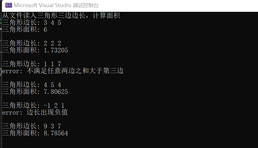 #include "Triangle.hpp" #include <iostream> #include <fstream> void test() { using namespace std; cout << "从文件读入三角形三边边长,计算面积" << endl; ifstream in("data3.txt"); if (!in.is_open()) { cout << "fail to open file to read\n"; return; } double a, b, c; do { cout << "三角形边长: "; in >> a >> b >> c; cout << a << " " << b << " " << c << endl; try { Triangle t(a, b, c); cout << "三角形面积: " << t.area() << endl << endl; } catch (const exception& e) { cout << "error: " << e.what() << endl << endl; } if (in.peek() == EOF) break; } while (1); in.close(); } int main() { test(); }