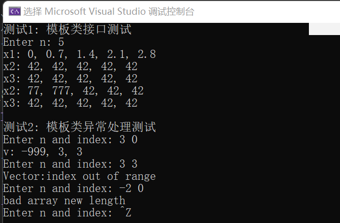 #include <iostream> #include "Vector.hpp" void test1() { using namespace std; int n; cout << "Enter n: "; cin >> n; Vector<double> x1(n); for (auto i = 0; i < n; ++i) x1.at(i) = i * 0.7; cout << "x1: "; output(x1); Vector<int> x2(n, 42); const Vector<int> x3(x2); cout << "x2: "; output(x2); cout << "x3: "; output(x3); x2.at(0) = 77; x2.at(1) = 777; cout << "x2: "; output(x2); cout << "x3: "; output(x3); } void test2() { using namespace std; int n, index; while (cout << "Enter n and index: ", cin >> n >> index) { try { Vector<int> v(n, n); v.at(index) = -999; cout << "v: "; output(v); } catch (const exception& e) { cout << e.what() << endl; } } } int main() { cout << "测试1: 模板类接口测试\n"; test1(); cout << "\n测试2: 模板类异常处理测试\n"; test2(); }