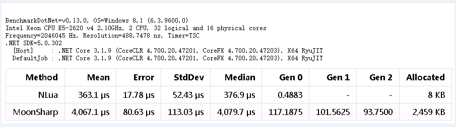 对lua脚本解释器库NLua和MoonSharp进行基准测试,用于比较那个性能更加优秀