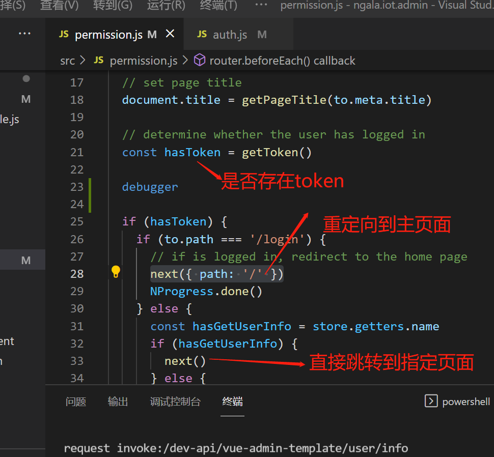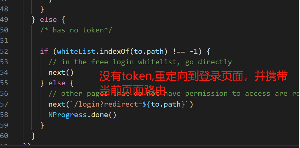 后台页面页面——>(permission.js)进行权限判断,存在token则直接跳转到目标反问页面,不存在token,重定向到登录页面