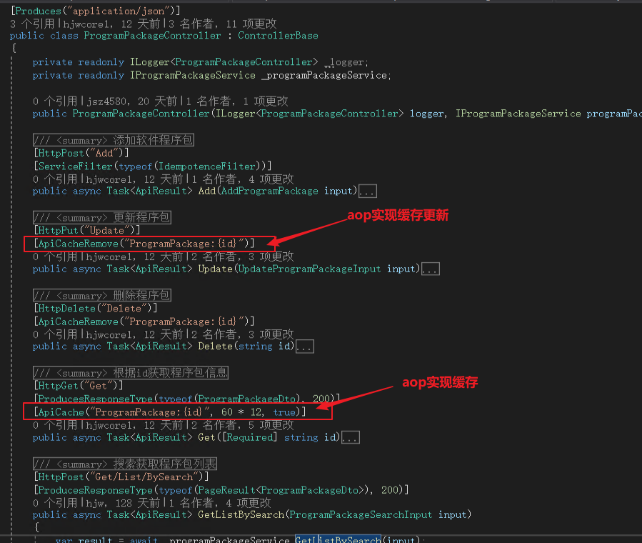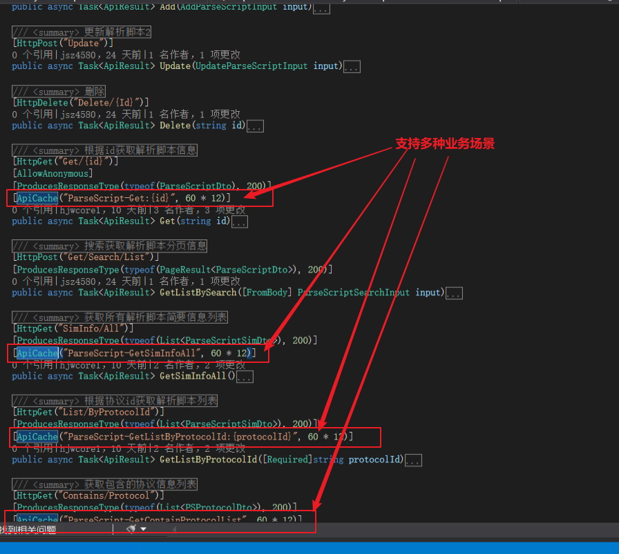 (5)提供缓存过滤器ApiCache:,示例: [ApiCache("UserRoles:{id}", ApplicationConst.Cache.ApiCacheTime,true)],同时提供移除缓存过滤器,示例: [ApiCacheRemove("UserRoles:{id}")],在更新的接口中可以通过该特性动态的删除缓存,保证数据一直性。