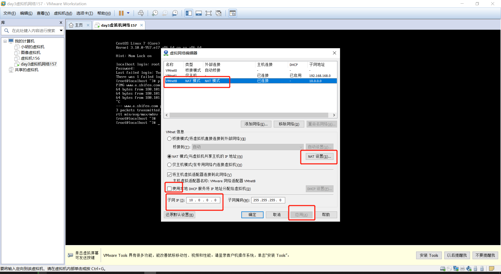 - 选择NAT网卡→取消DHCP→修改子网IP和虚拟机IP在同一时间段→打开NAT设置→配置网关