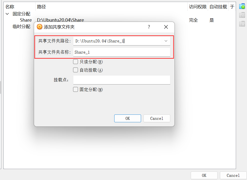 第一行在对应路径下创建文件夹share_1,第二行将win11中创建的Share_1与Ubuntu20.04中创建的share_1关联起来。