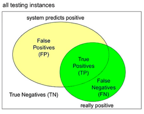当系统将样本分为真(positive),假(negative)两类,下方框图表示所有需要的样本(all testing instances),其中黄色圆圈代表预测为真(positive)的样本,绿色圆圈代表实际为真(positive)的样本。