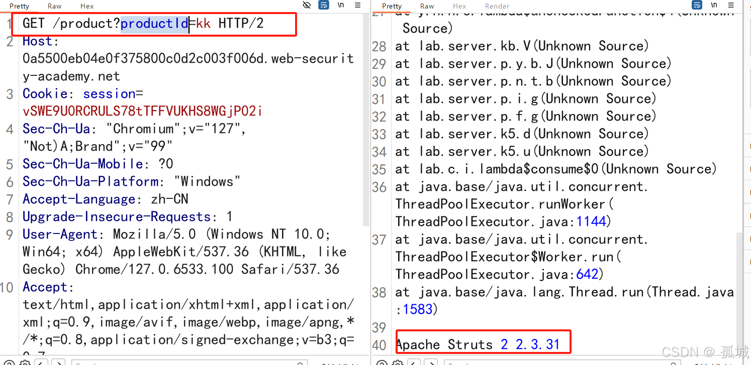 通过提示我们知道需要我们找到第三方框架版本号才能过关,在一阵抓包以后发现在主页点击产品然后进行抓包去修改productId的值修改为非数字就可以在回包中看到版本号了