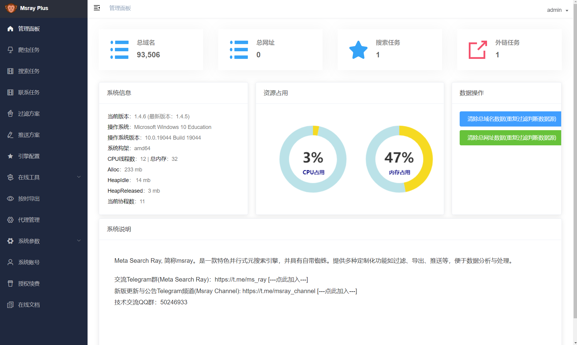 MSRAY-PLUS提供基于浏览器的图形化操作界面,智能获取资源。支持亿级数据处理,利用强大的数据获取能力,抓取互联网上所有主流渠道的企业信息资料,并支持导出,再次整理。